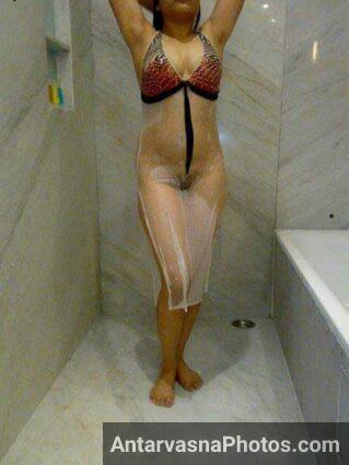 Bathroom me nahati hui badi chut dikhati hui rajni sharma ko dekhe. Devar mukund ne apne mobile se bhabhi ke is bade bhosde ke pics liye.