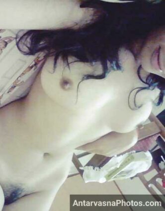 Ab is sexy ladki ne apni bra ko khola aur apne bade boobs se khelne lagi. Teena ko ab Mohan ne panty kholne ko kaha. Teena ne bade hi nakhre ke sath panty niche sarka daali. Mohan ke samne ab uski sexy girlfriend ki semi hairy chut thi. Wo uth ke fridge se ek gajar le aaya. Teena ne apni taange kholi aur apni garam chut ke andar thanda gajar daal diya. Dosto aaj ke in hot pics me aap bhi is sexy ladki ko dekhe.